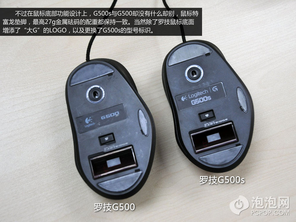 另外,在鼠标底部的其他设计方面,G500s依旧采用三片式特富龙材质垫脚,并且搭配了一个种类为27g左右的金属砝码,这与老款鼠标G500的设计保持一致。不过鼠标的型号标识,有G500换成了G500s,并且增加了那个被演绎过大写“G”的LOGO。