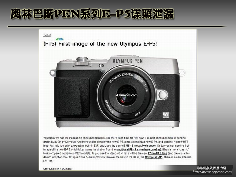 外网43rumors.com日前透露奥林巴斯PEN系列新品E-P5即将登场,随之而来的还有一张清晰谍照。