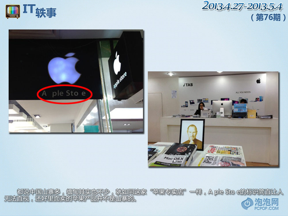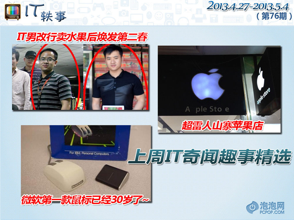 最新一期的IT轶事又在周末和大家如期见面了,上周IT圈都发生了哪些令人啼笑皆非的奇闻轶事呢:上周微博上疯传一男IT程序员改行卖水果后焕发第二春,整个人都回到了大学时代的精气神,看来IT界真是太催人老了;缅甸一家山寨苹果店店标超雷人,对比国内山寨苹果店绝对是有过之而无不及;不知不觉中,微软第一款鼠标已经满30岁了,和最新的Surface专用鼠标相比就像爷孙俩。本周完整IT轶事内容敬请阅读。2/11