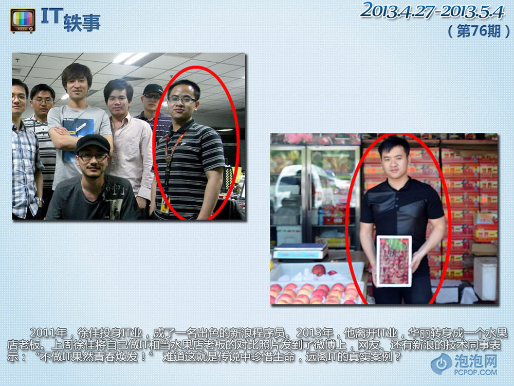 2011年,徐佳投身IT业,成了一名出色的新浪程序员。2013年,他离开IT业,华丽转身成一个水果店老板。上周徐佳将自己做IT和当水果店老板的对比照片发到了微博上,网友、还有新浪的技术同事表示:“不做IT果然青春焕发!” 难道这就是传说中珍惜生命,远离IT的真实案例?