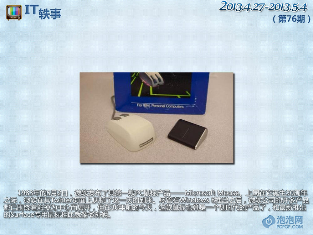 1983年的5月2日,微软发布了其第一款PC鼠标产品——Microsoft Mouse。上周在它诞生30周年之际,微软在其Twitter页面上庆祝了这一天的到来。尽管在Windows 8推出之后,微软公司的许多产品都已围绕着触摸为中心而展开,但在30年前的今天,这款鼠标也算是一个划时代的产品了,和最新推出的Surface专用鼠标相比就像爷孙俩。5/11