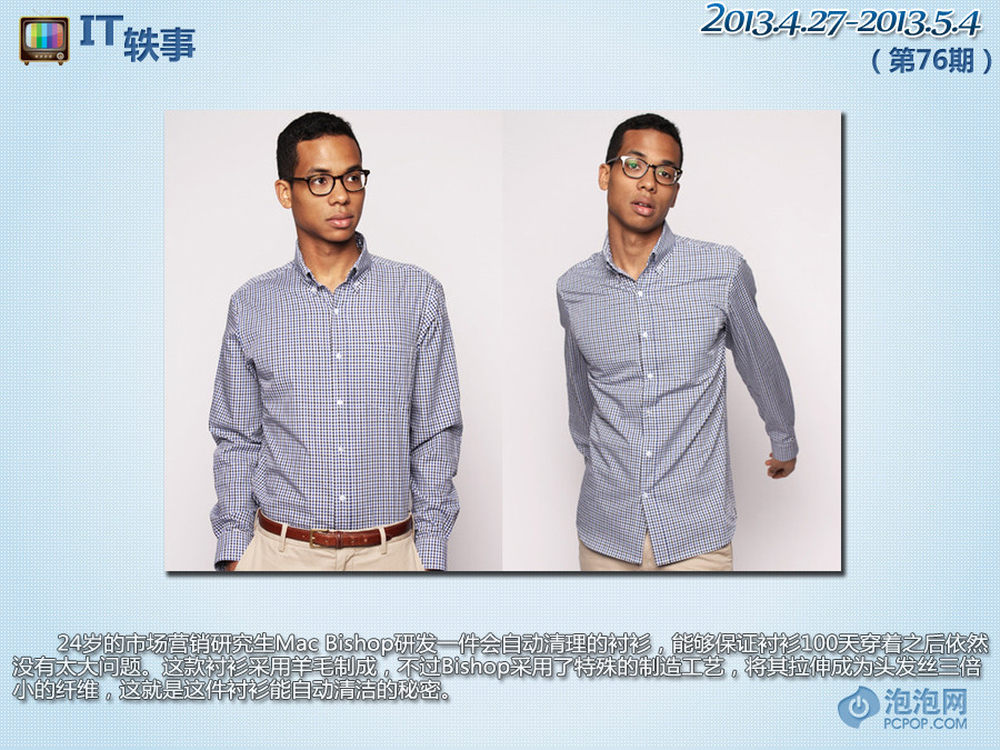 24岁的市场营销研究生Mac Bishop研发一件会自动清理的衬衫,能够保证衬衫100天穿着之后依然没有太大问题。这款衬衫采用羊毛制成,不过Bishop采用了特殊的制造工艺,将其拉伸成为头发丝三倍小的纤维,这就是这件衬衫能自动清洁的秘密。6/11