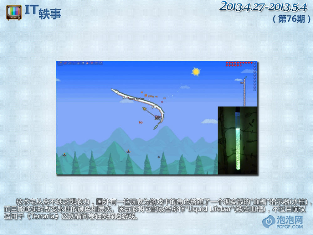 技术宅从来不缺乏想象力,国外有一位玩家为游戏中的角色搭建了一个现实版的"血槽"指示器(水柱),而且能够实时改变水柱的颜色和层次。该玩家将它的设备称作"Liquid Lifebar"(液态血槽),不过目前仅适用于《Terraria》这款横向卷轴类探险游戏。