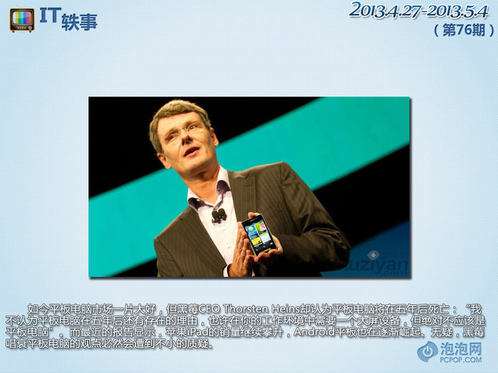 如今平板电脑市场一片大好,但黑莓CEO Thorsten Heins却认为平板电脑将在五年后死亡:“我不认为平板电脑在五年后还有存在的理由,也许在你的工作环境中需要一个大屏设备,但绝对不应该是平板电脑”。而最近的报告显示,苹果iPad的销量继续攀升,Android平板也在逐渐崛起。无疑,黑莓唱衰平板电脑的观点必然会遭到不小的质疑。