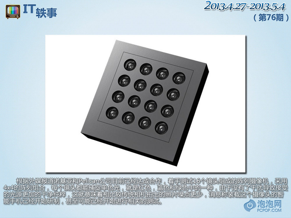 根据外媒报道诺基亚和Pelican公司目前已经达成合作,着手测试16个镜头组成的阵列摄像机,采用4x4的阵列组合,每个镜头都能捕捉单色光,就是红色,蓝色和绿色中的一种,由于没有了干扰导致接受的光源更加的干净纯粹,这就意味着相比较传统相机拍出的照片噪点更少,消息称装载这个摄像头的智能手机已经开始研制,甚至可能已经开始进行相关的测试。