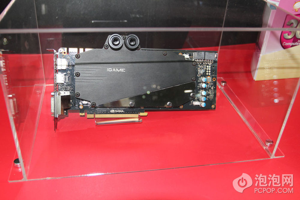 七彩虹iGame GTX Titan阿诺斯显卡采用的是全覆盖式水冷散热器,纯铜底座设计,可同时为GPU、PCB正面的显存和供电电路散热,其中GPU部分有专门的密集式水槽,加快GPU的散热速度。而在预设频率上,七彩虹为这款显卡进行了预超频设计,核心/Boost频率为945/1006,比公版837/876MHz的参数要高出超过100MHz,显存频率则维持1502MHz(数据频率6008MHz)不变。13/16