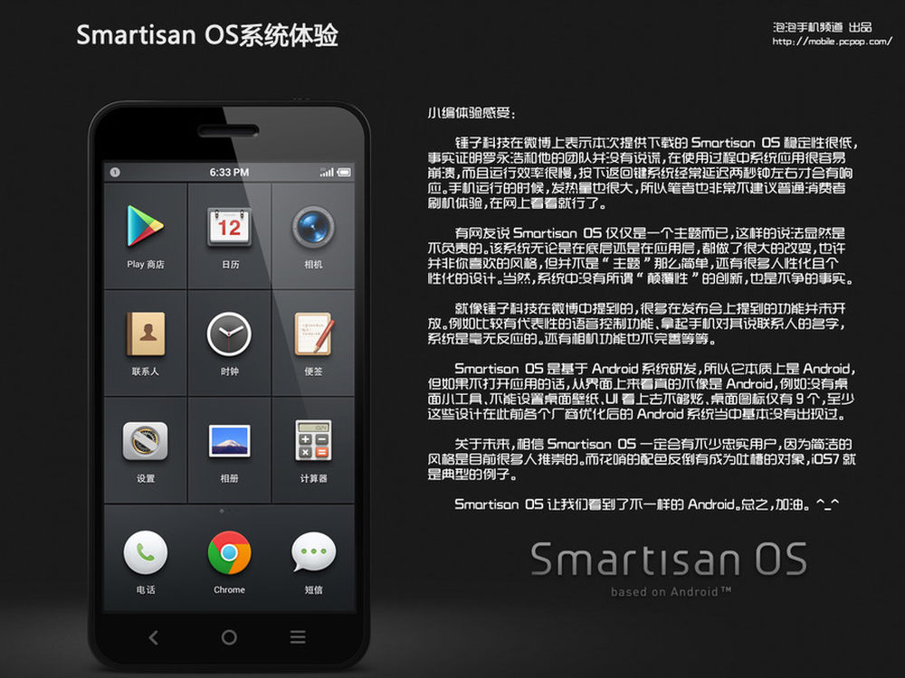 Smartisan OS是基于Android系统研发,所以它本质上是Android,但如果不打开应用的话,从界面上来看真的不像是Android,例如没有桌面小工具、不能设置桌面壁纸、UI看上去不够炫、桌面图标仅有9个,至少这些设计在此前各个厂商优化后的Android系统当中基本没有出现过。