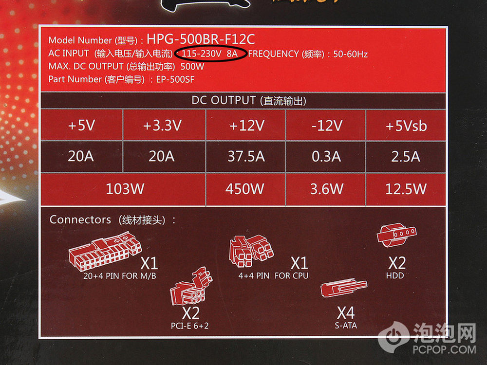 黑框中是真铜牌的一个标志,假铜牌这里最低电压一般是170V,因为他们没法保证电源在115V下满载。此外电源包装盒上已经印全了功率分配和供电接口数量。专门去80PLUS官网核实了一下,型号为HPG-500BR-F12C的铜牌认证产品是2010年11月就通过测试的,看来是一个很成熟的方案了。3/20