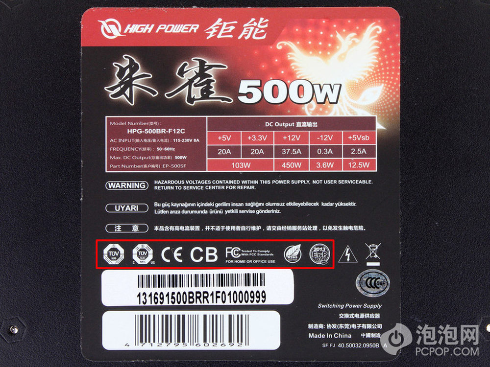 500瓦电源的12V输出在各版本规范中都没有规定,但能有450瓦还是比较合适的量,电源参数标注的很规范,红框内是多国安规,这也是体现工厂实力的部分,总的来说这个电源的标签很规范。11/20