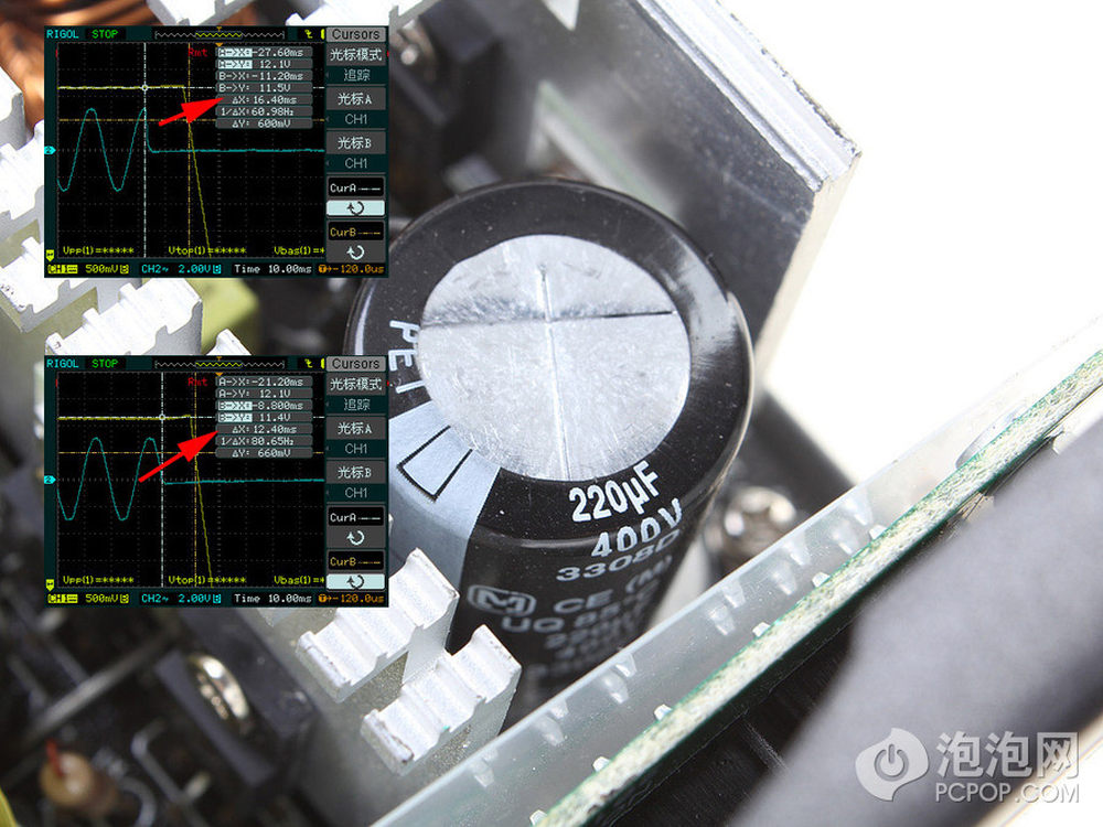 在400瓦负载下,也就是80%%满载下,保持时间将将过16ms,可以算合格。主电容来自松下,220uF,400V耐压,很不错的牌子。16/20