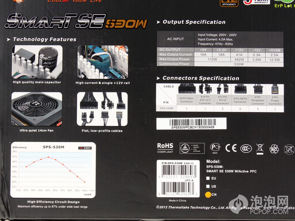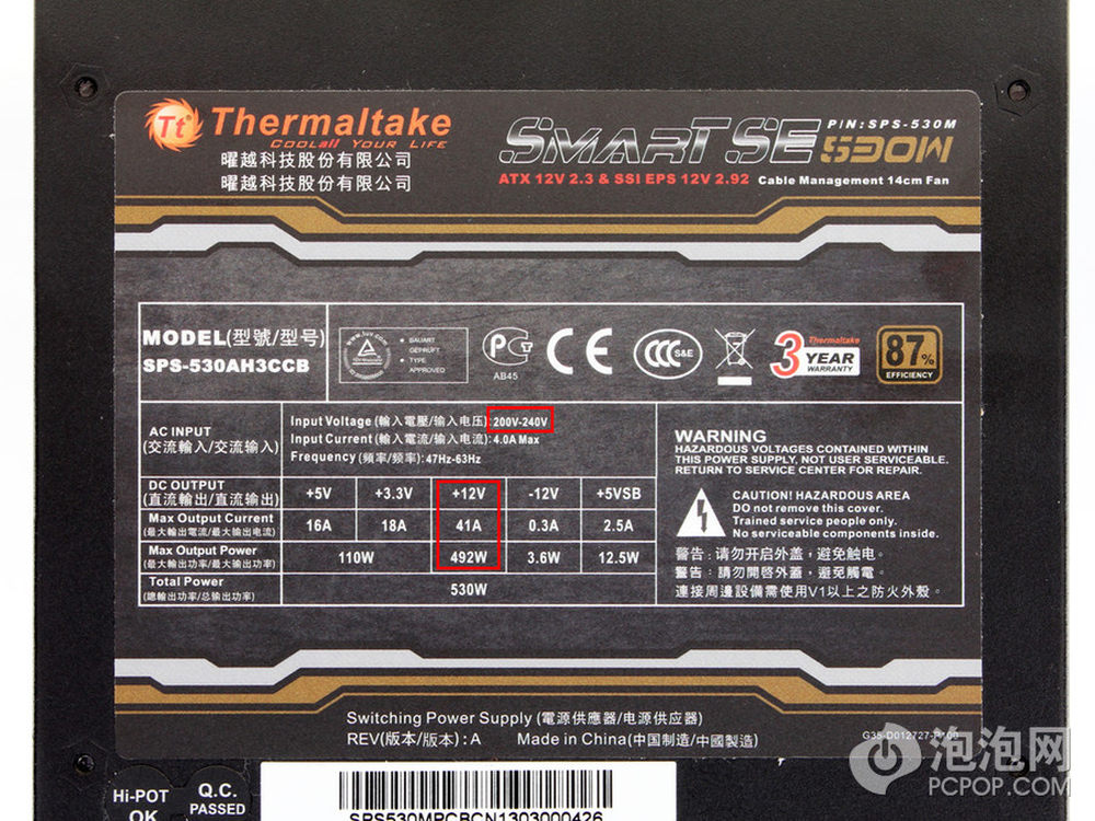 530瓦电源的12V输出能力有492瓦,已经算较高的了,给HD7970GE或者泰坦供电都没问题。200V-240V的输入电压就意味着他不能过80PLUS,而右侧却发现了一个仿80PLUS铜牌的Logo,只不过这个是自己设计的87%% EFFICIENCY。9/19