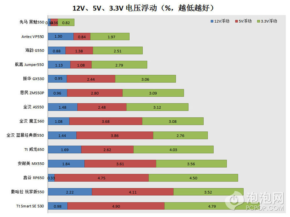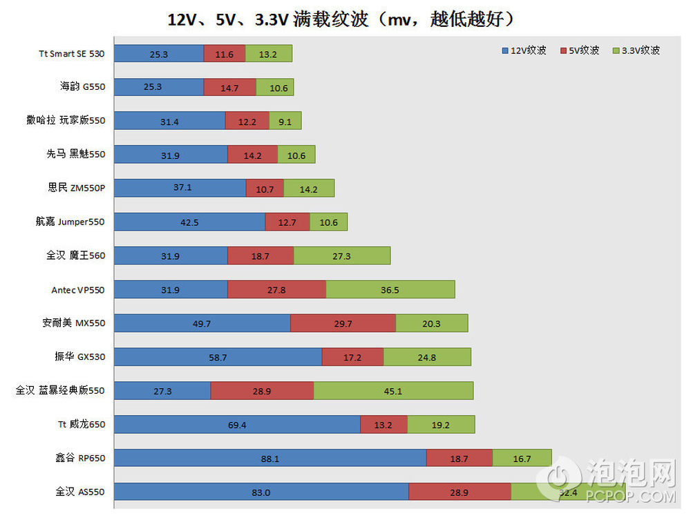 电压浮动和满载下纹波测试结果。5V和3.3V的浮动较大,12V浮动小。纹波整体都很低。6/19