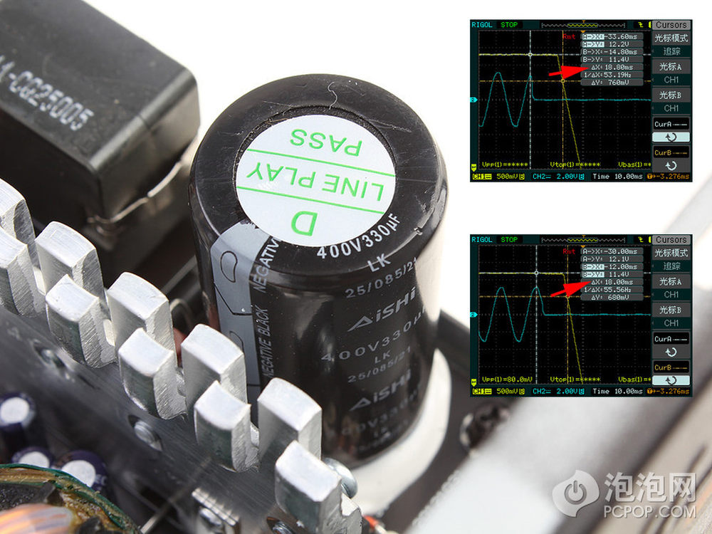 满载下18.8ms的保持时间,450瓦负载下18ms的保持时间,表现不错。主电容是国产的Aishi,330uF,400V耐压,85摄氏度耐温。14/19