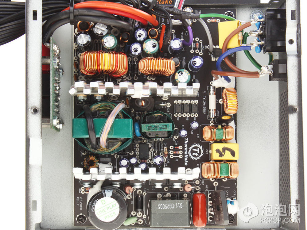 最高效率85.9%%,电源在550瓦负载时效率擦边高过80%%。电源外壳用贴纸做了装饰,而且在出线一侧还凹刻了Tt 的品牌名称。4/19
