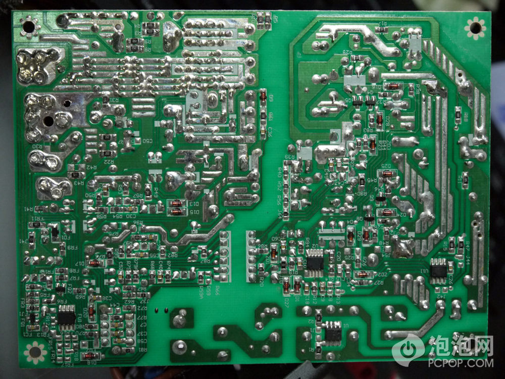 PCB背部有大量贴片元件,手工补锡的地方并不多,这在入门级型号的电源上并不多见。19/19