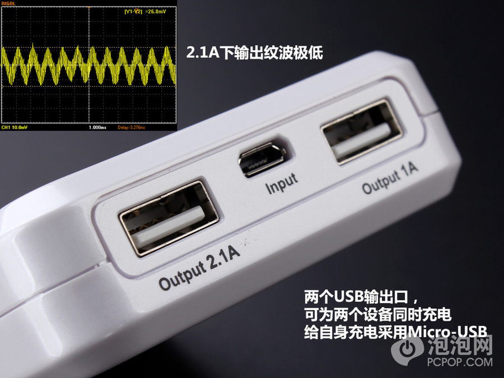 电源的2个口明确标注了输出电流值,如果用的是iPad就插在2.1A的口上,如果用的是手机,则插在任意口上都可以。中间比较小的是Micro-USB接口,用来给电源自身充电。不过因为充电电流只有1A,所以要把一个用光电的PN-104充满至少需要11个小时。
