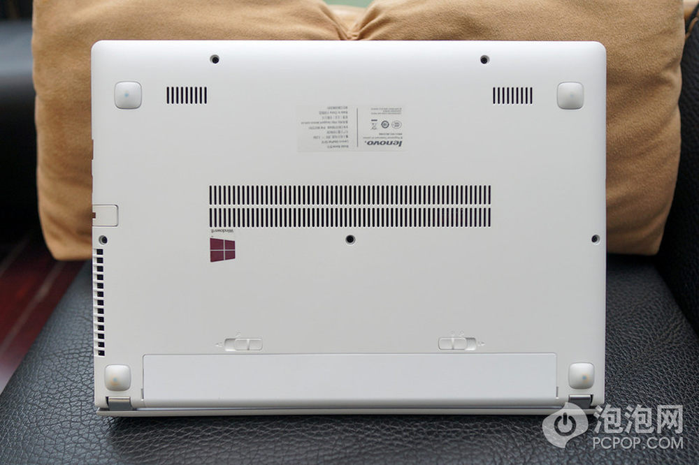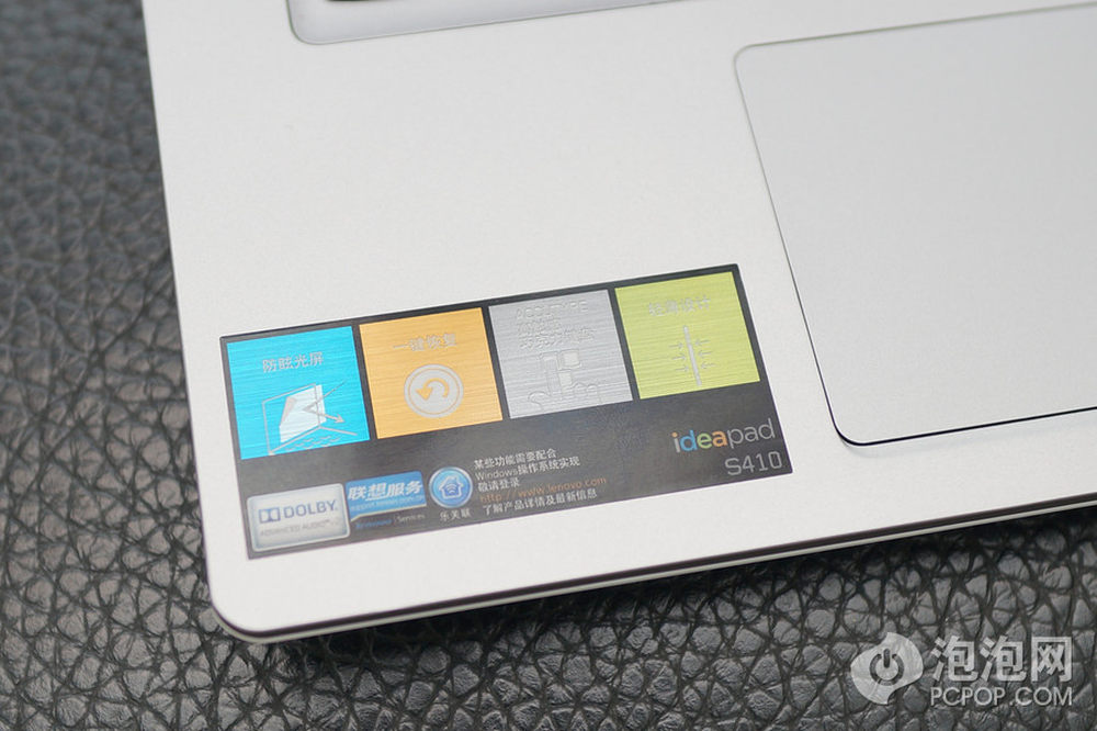S410机身C面左下角是这台机器的特性注释标签,防眩光雾面屏、一键恢复系统、高触感键盘和超轻薄设计,此外S410还支持杜比音效及联想的全套乐关联服务。11/16