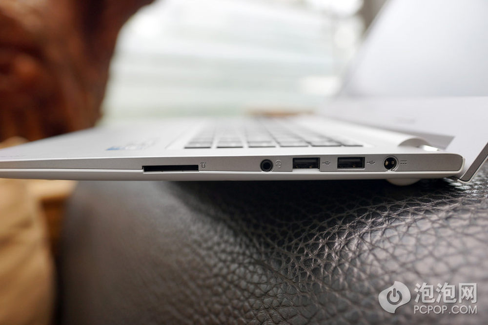 机身右侧接口布局上,S410有圆形电源口、双USB2.0、耳机麦克风和SD读卡器。S410在主流接口的配备上还是非常齐全的,VGA接口在轻薄本和超极本上已经很难见到,所以S410没有配备也是符合情理的。15/16