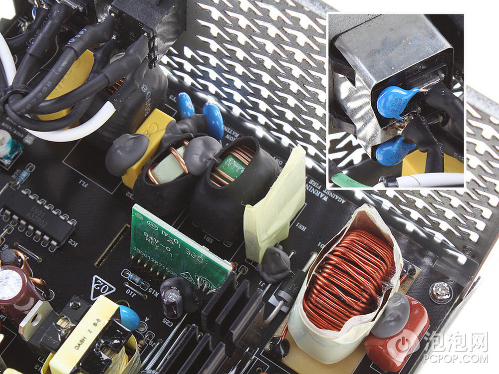 二次侧采用了10枚日化KZR系的电解电容,输出线材的根部都没套热缩管但箍了金属环才过的波峰焊,全汉在这个系列上一直这样处理。这颗电源的12V和5V采用同步整流,这是一种利用Mosfet来模拟肖特基二极管动作的方法,最大的好处是可以大幅度降低导通时的电阻减少功耗的损失,而开闭时的损耗就不是元器件特性能把控的,更多还是要看控制器的动作。19/20