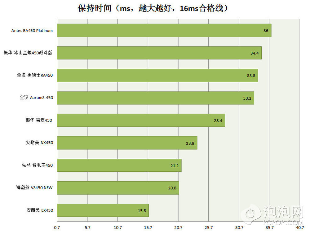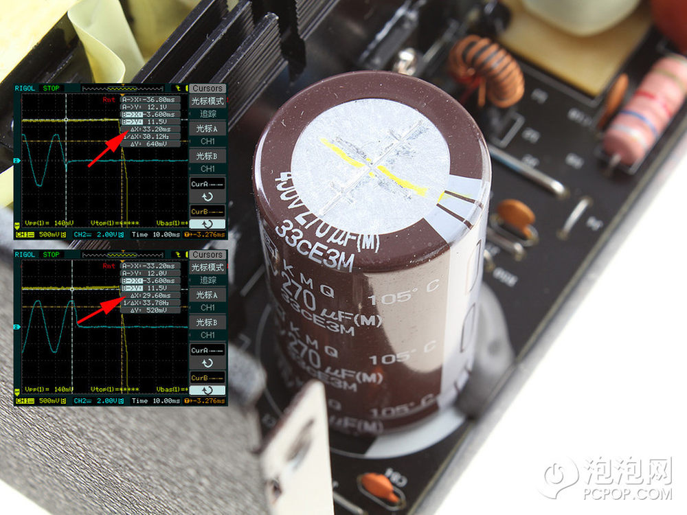 保持时间的测试成绩实在太棒了,超过16ms基础线一倍多,主电容是日化出品KMQ系,耐压450V,耐温105℃,是PC电容中主电容用料非常好的级别。17/20