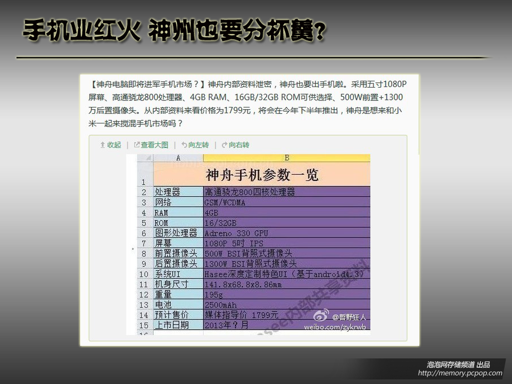 软件方面,运行最新的Android 4.3系统,拥有2500mAh的电池,容量上有16/32GB两种版本选择,售价为1799元。且不论该机一出,小米之流是否会就此暗淡无光。此条爆料的真实性还有待证实,因为其内部资料表示神舟手机拥有4GB的RAM空间,而三星只不过才刚刚量产4GB。大家还是不要过分激动的好。3/10