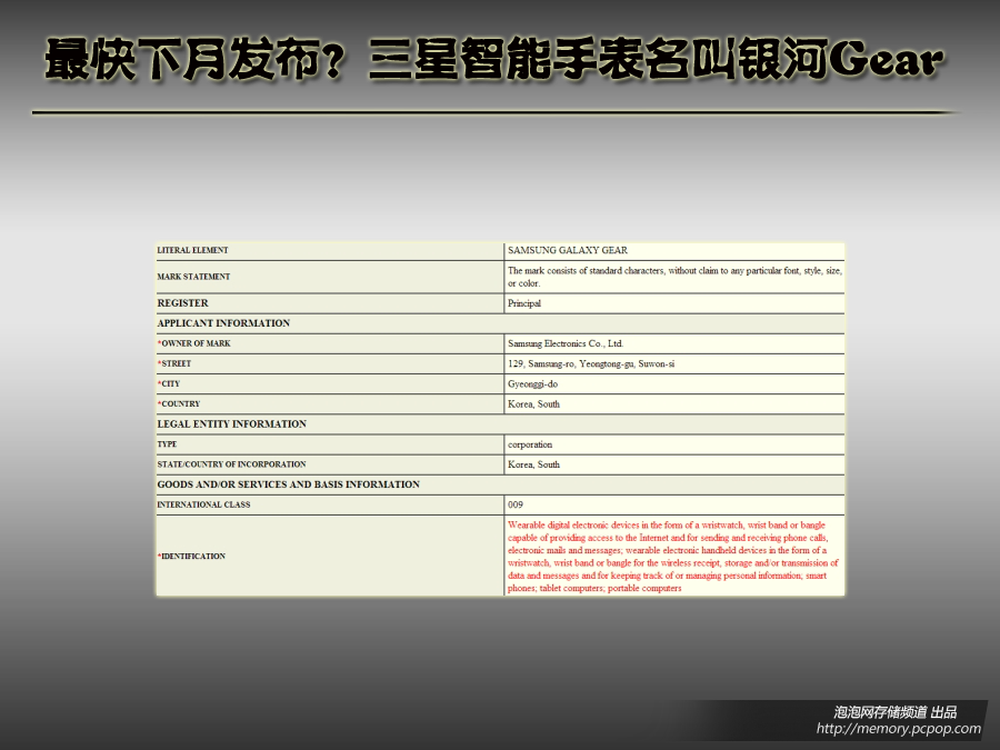 越来越多的消息表明三星智能手表就快来了,荷兰一家网站揭露三星新注册了“Galaxy Gear”商标,而注册平台对该产品的描述为:“可穿戴的手腕产品,能够实现互联网接入,可发送接受短信/电话,可传输并跟踪个人信息,能与智能手机、平板电脑及笔记本电脑同步”。