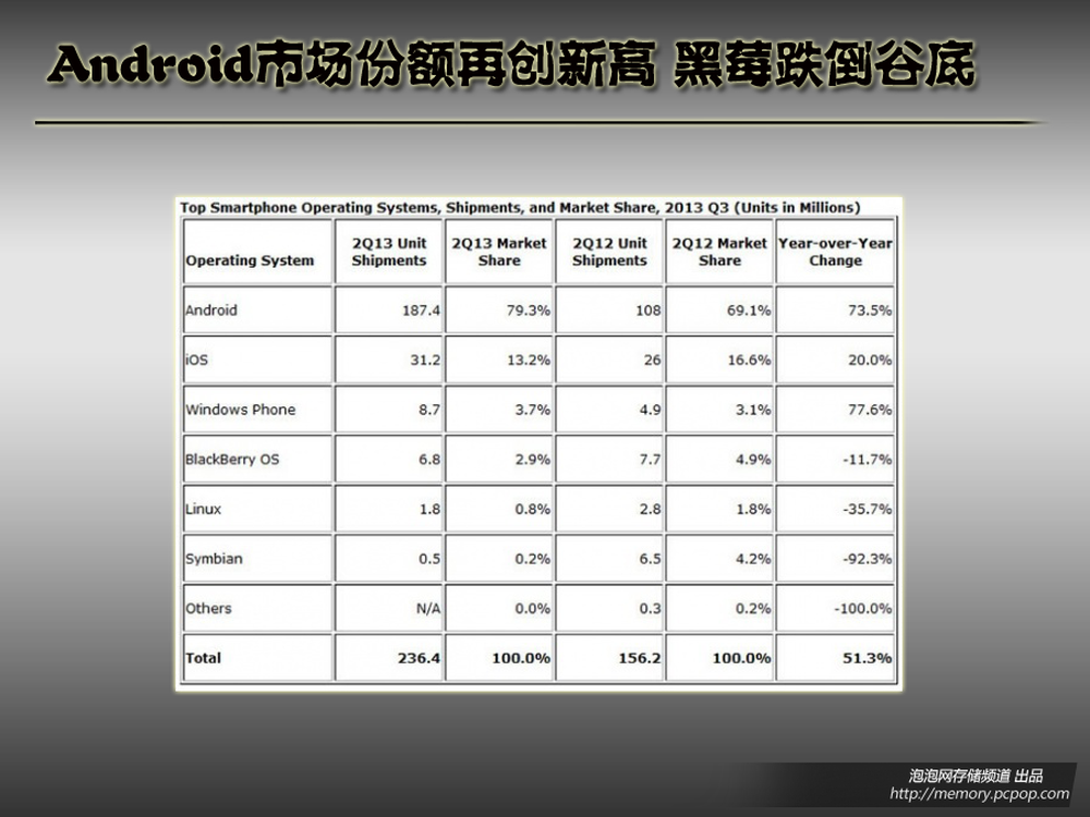 黑莓1月份推出黑莓10操作系统,全场份额只有3%%,表现很是糟糕,降到IDC有记录以来的最低点,不客气的说Z10的不成功导致了这一切。另外苹果iOS依然是Android最强力的竞争者,两者之间的距离是越来越远,主要是因为苹果正在准备新的iPhone。尽管苹果第二季度出货同比增长20%%,市场份额却从一年的16.6%%降到13.2%%。5/10