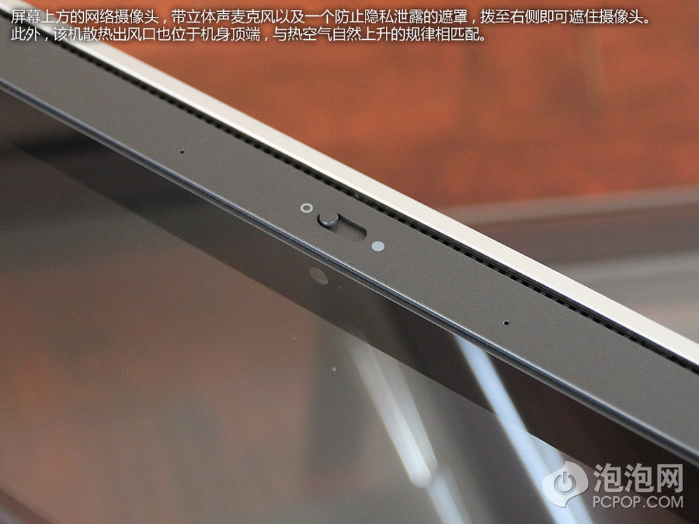 XPS One 2720屏幕上方集成一颗网络摄像头,带立体声麦克风以及防止隐私泄露的遮罩,不用的时候只需把上面的拨杆拨至右侧即可。此外,该机在顶部提供了很多散热出风口,散热方式遵循了热空气自然上升的原理。7/20