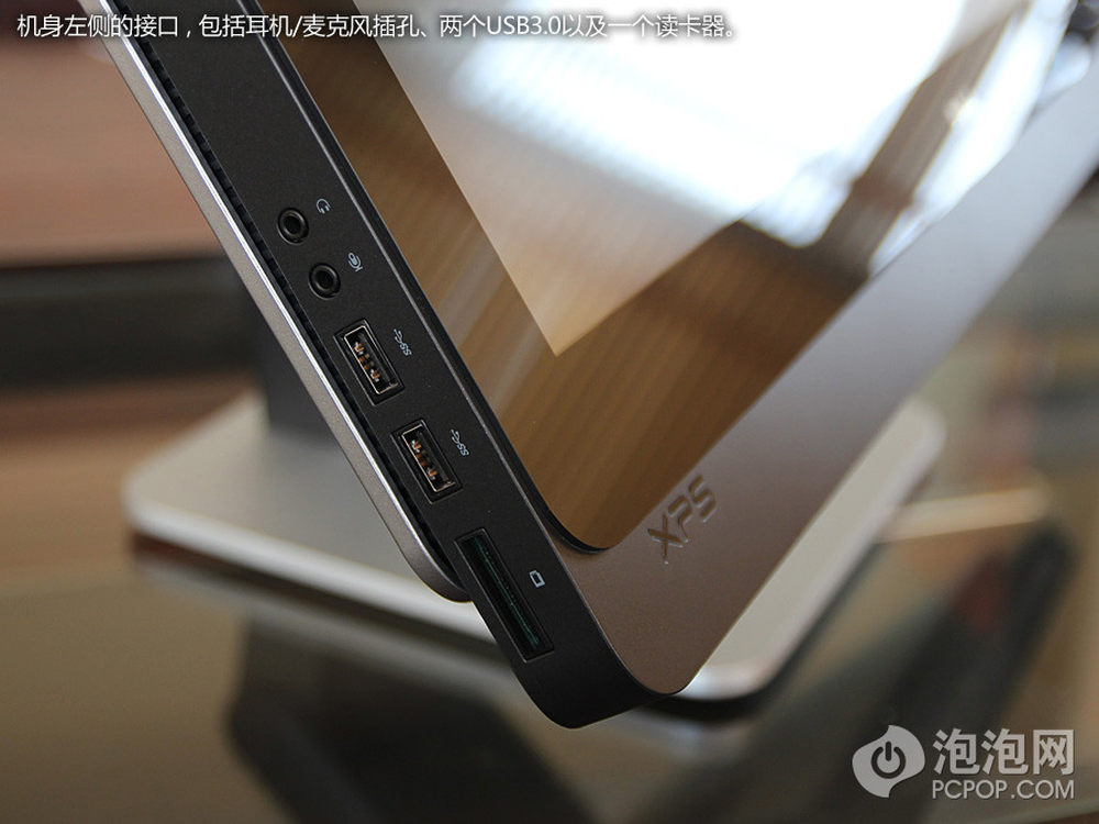 XPS One 2720机身左侧接口不多,但都很实用,包括一组音频接口、两个USB3.0以及一个九合一读卡器。10/20