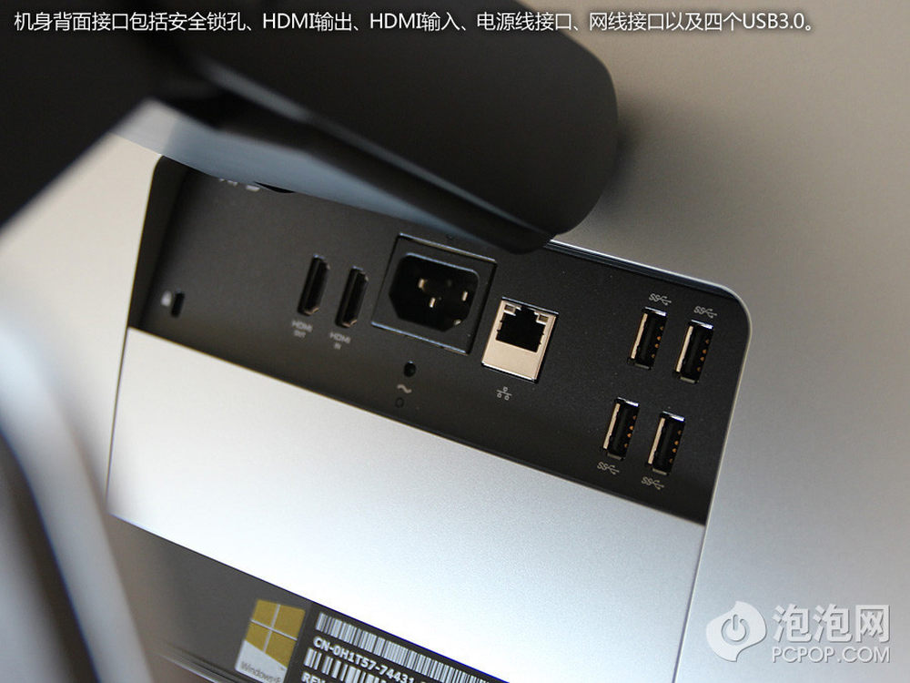 戴尔XPS One 2720的机身后侧,提供一个安全锁孔、一个HDMI输出、一个HDMI输入、电源接口、网线插孔以及四个USB3.0接口。17/20