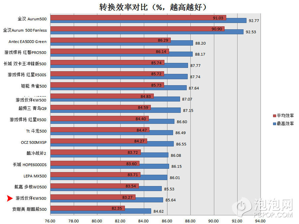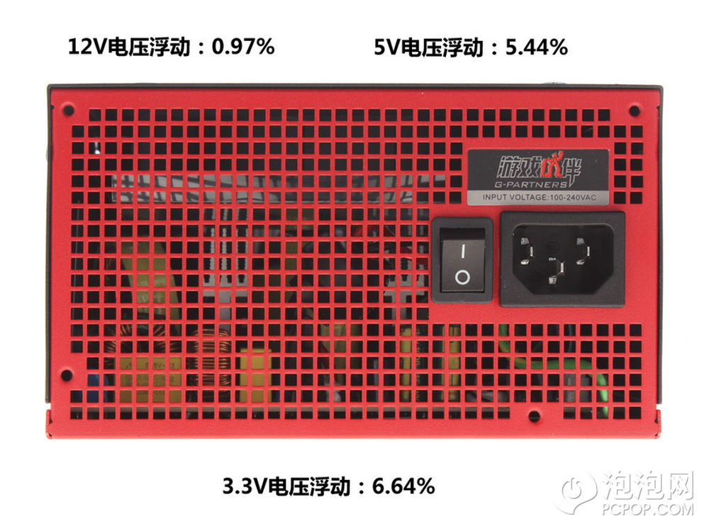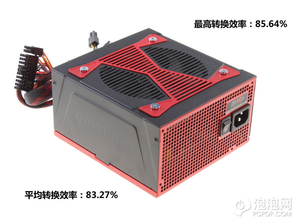 最高效率85.64%%,平均也有83%%以上。这个电源突出的一点就是外观设计很靓,500瓦电源排成排KW500一定是最吸引人的那一个,电源的风扇罩的纹理和游戏伙伴品牌的Logo神似。红黑搭配的外壳游戏化十足,另外补充一点的是在220V输入电压下满载转换效率81.15%%。4/22