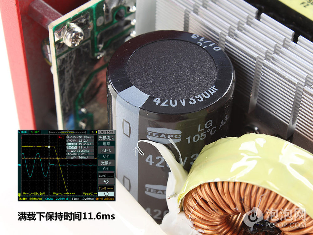 保持时间我忘了截图400瓦下的结果,实际上是16.4ms,已经超过了16ms的及格线。满载下是11.6ms。为保持时间提供保证的是一枚TEAPO,420V耐压、390uF容量,105摄氏度耐温的电容,台系一线不错。14/22