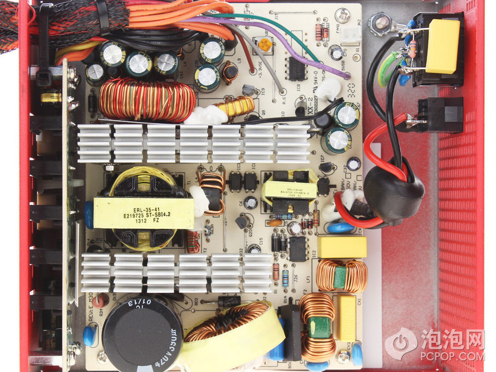 电源的EMI滤波上设置了3个X电容,两对Y电容,两个共模电感,一个MOV,一个保险管,AC输入口的泄电电阻也没有省略。整流桥并没有贴散热片,10A的器件,在115V输入电压下将将可以提供额定的500瓦功率。但是和后续的电容靠太紧密,如果满载低压输出时,这枚蓝色的电容寿命会是问题。18/22