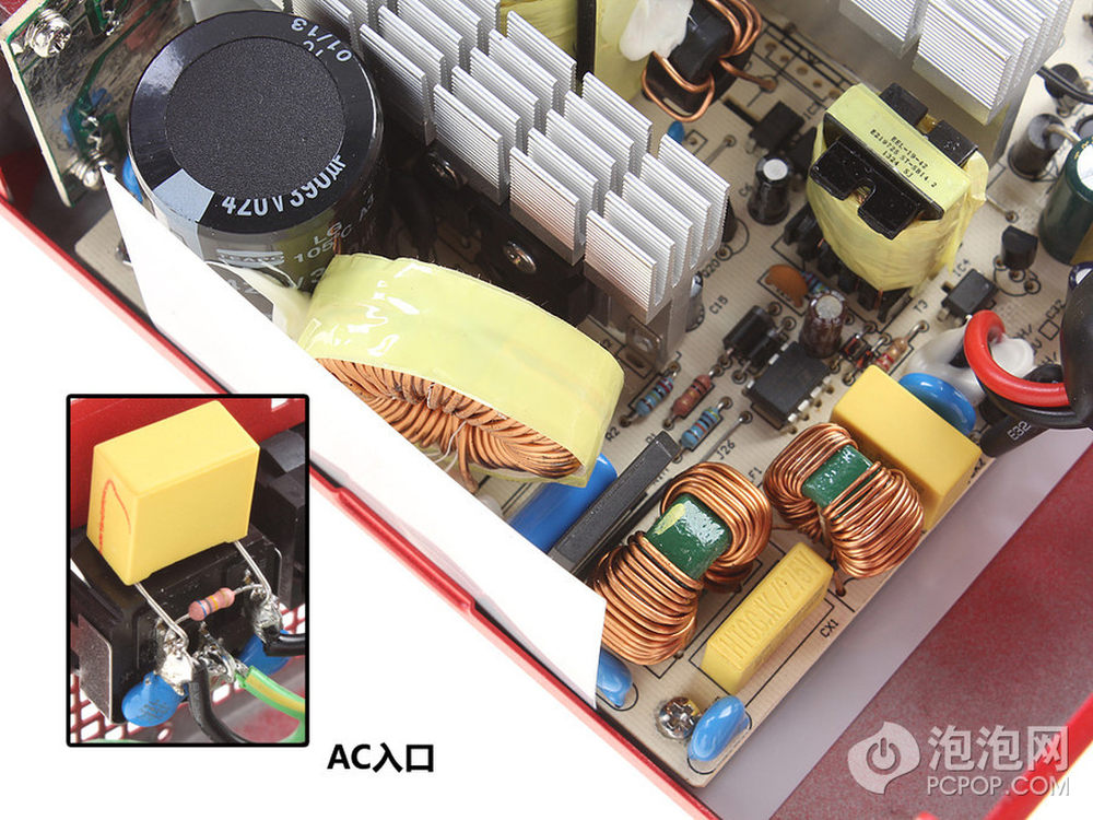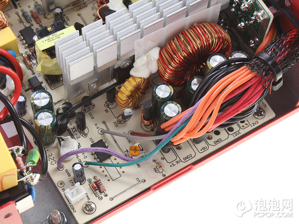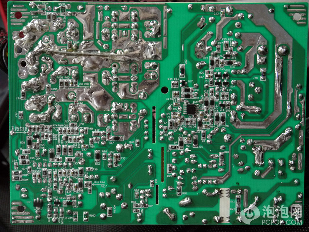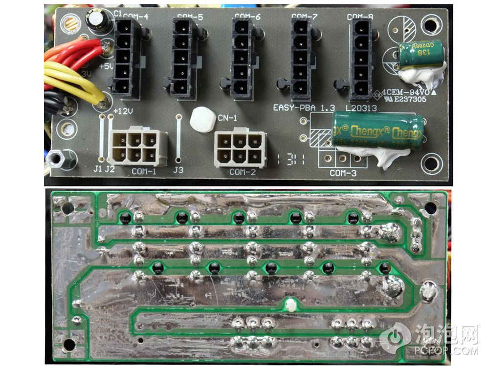 模组化线材接口导入的线并没有套金属环,可能如果套了就不容易弯折。输出部分还安放了2颗电容。对于12V来说,接口板上既有SATA和PATA,还有吃电大户显卡的2个PCIE供电口,而只分配了3根18AWG线肯定是少了,要知道一个PCIE口就要配3根线。接口板背部大量补锡增加散热和过流能力。21/22