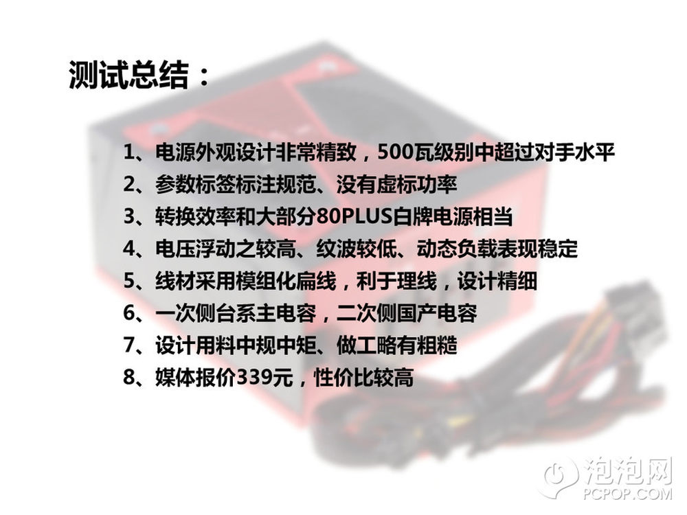 从2012年开始杀入DIY圈做电源的外设厂商就已经不太容易赚到钱了,虽然看上去出厂价和售价差距比主板显卡大,但经常会落入卖不动的局面。游戏伙伴作为2013年进入市场的品牌肯定也要面临这样的挑战,所以不论从产品外观还是代工上都要花几倍于对手的力量才能获得同样效果。这颗KW500的表现中规中矩,优势在于价格只有339元。