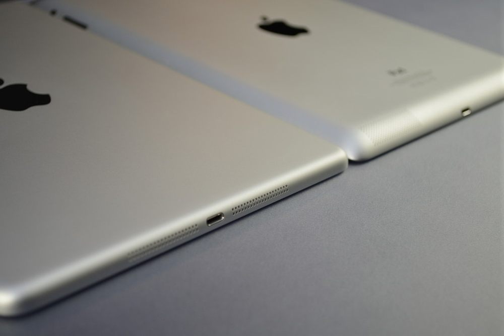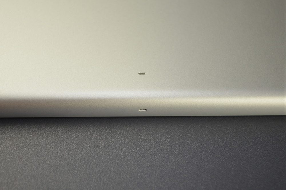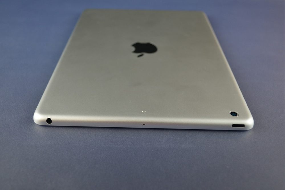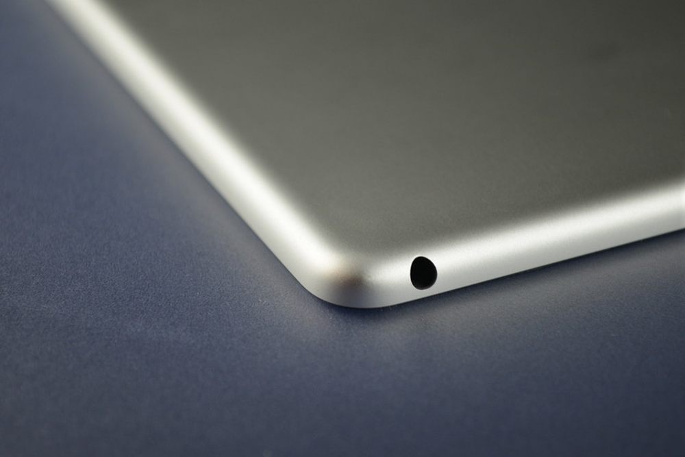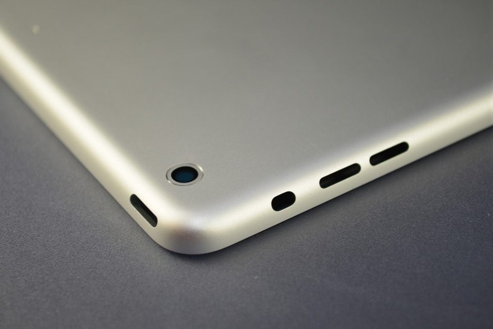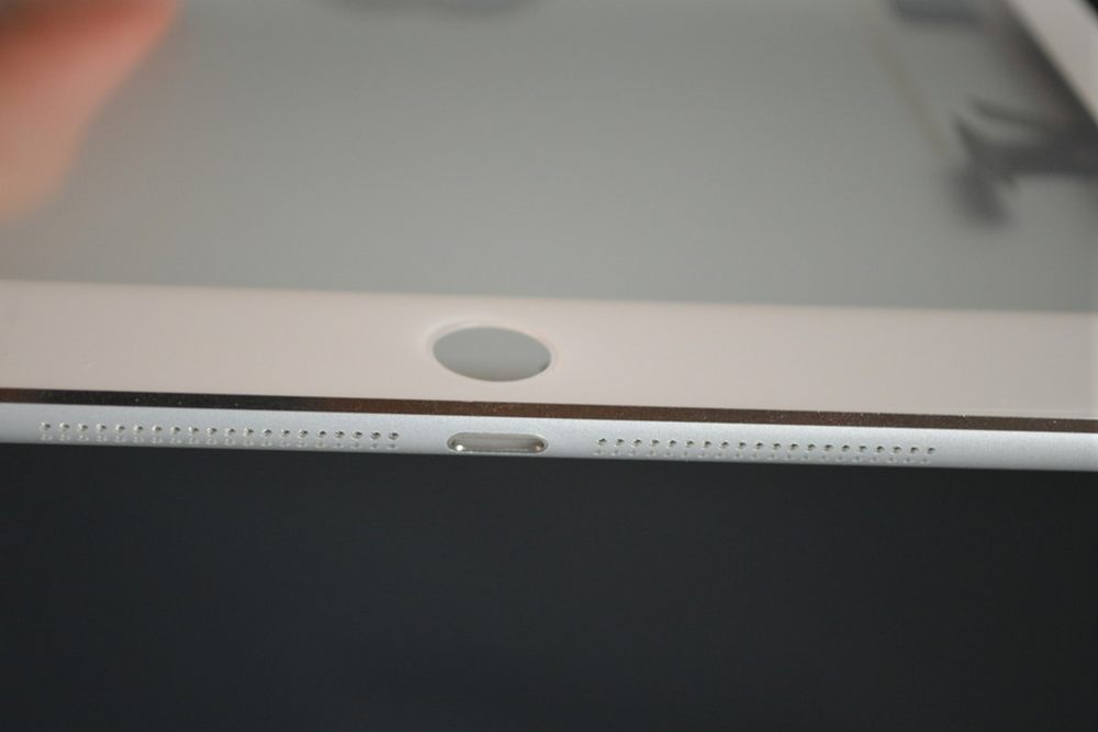 iPad 5和iPad 4在机身键位上并没有什么太大的区别,我们常见的开关键、静音锁定/旋转锁定、音量键和Lightning插口都在原位,最明显的变化就是iPad 5瘦了很多,边角的弧度更饱满了,扬声器的出音孔也设计在了底部,银色包框等部件也在iPad 5上可以看到。