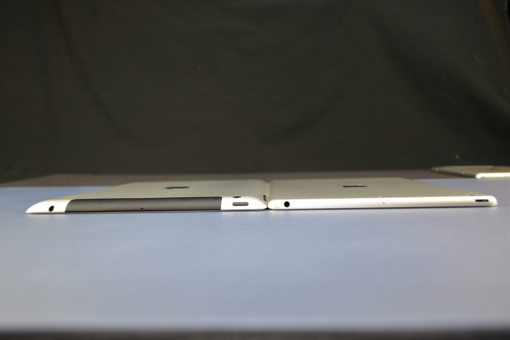 iPad 5相较iPad 4机身厚度有所减少,从微距对比大图来看,大概薄了1-2mm之间,而且新的iP10/28