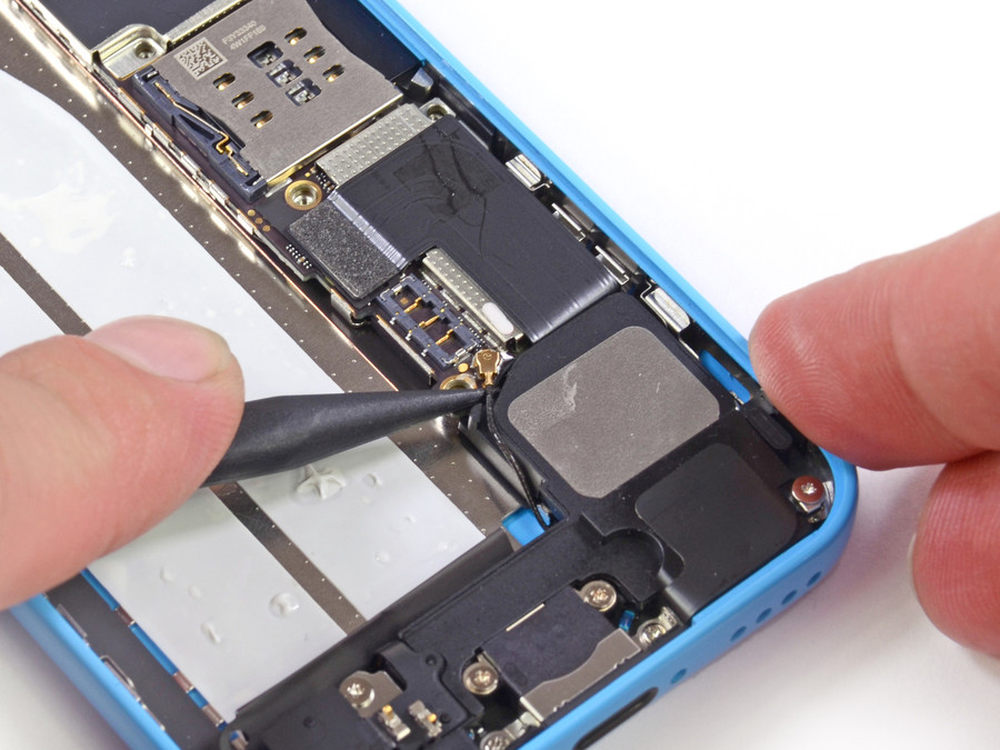 iPhone5c的电池与主板连接部位有金属板固定,拆下电池的时候需要卸下金属板。