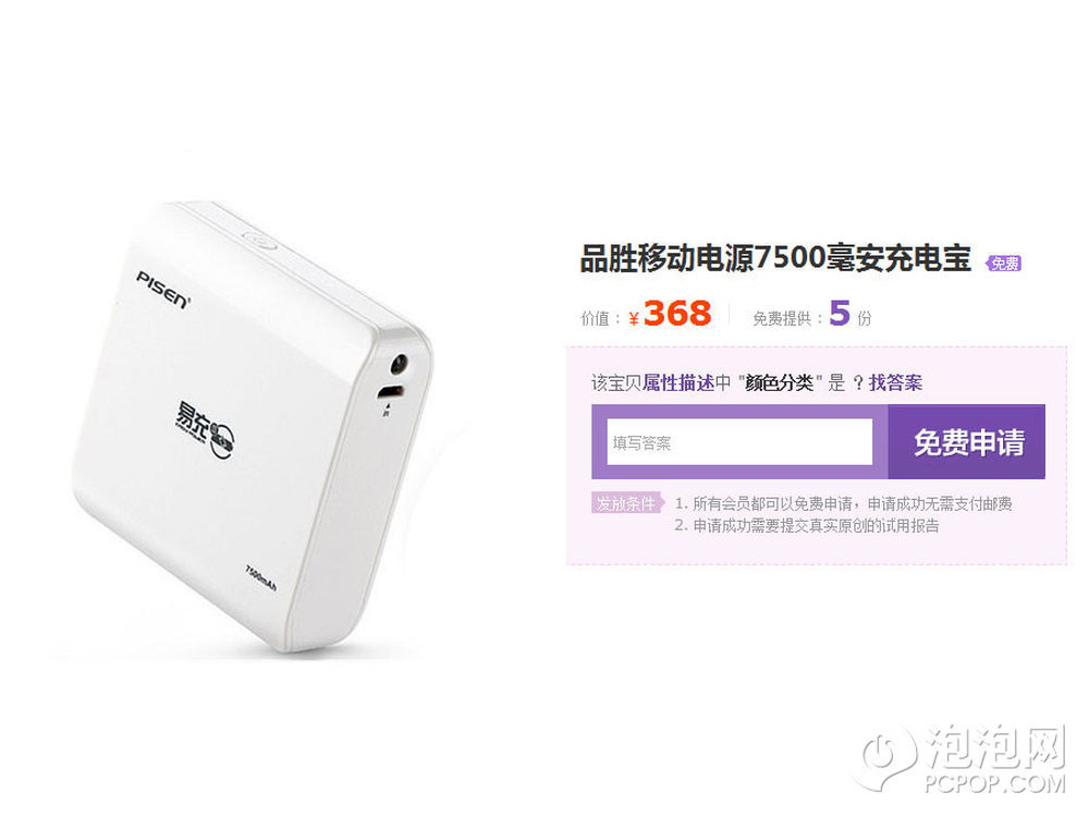 Pisen 品胜 易充三代7500mAh 移动电源 售价368元 免费试用>> 试用申请链接