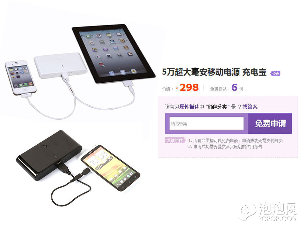 这个推荐,依旧是个移动电源,不过这个移动电源的容量,大的有点儿惊人——5万毫安时!原售价298元,现在可以免费申请试用。移动电源配有两个USB接口,分别可以输出1A和2A的电流,可以给iPad和手机同时充电。不过,容量如此直达的移动电源是否安全,这倒是个未知数。感兴趣的朋友可以去看看,免费申请试用一个。如果要是自己买的话,其实也不贵,仅需要人民币79元,而且