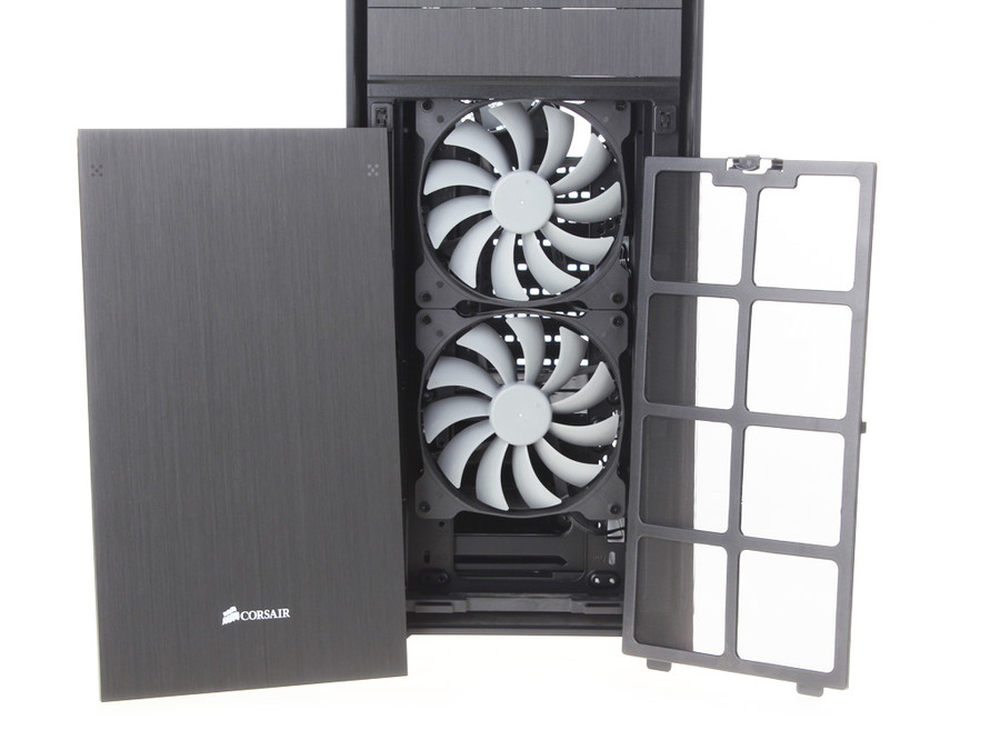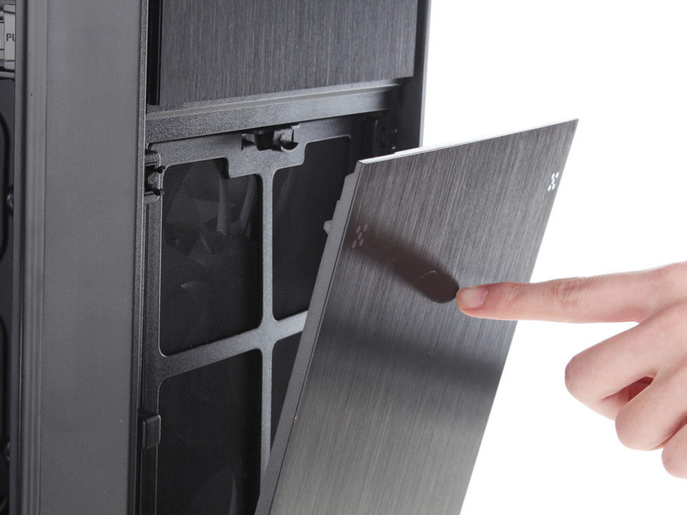 “弹开”面板之后,可见面板内部的防尘网,防尘网拆装也非常方便,向下拨动即可拆下防尘网,在长期使用之后可以方便用户清洗防尘网。弹起的前面板也为用户更换前置散热风扇提供了便利。6/32