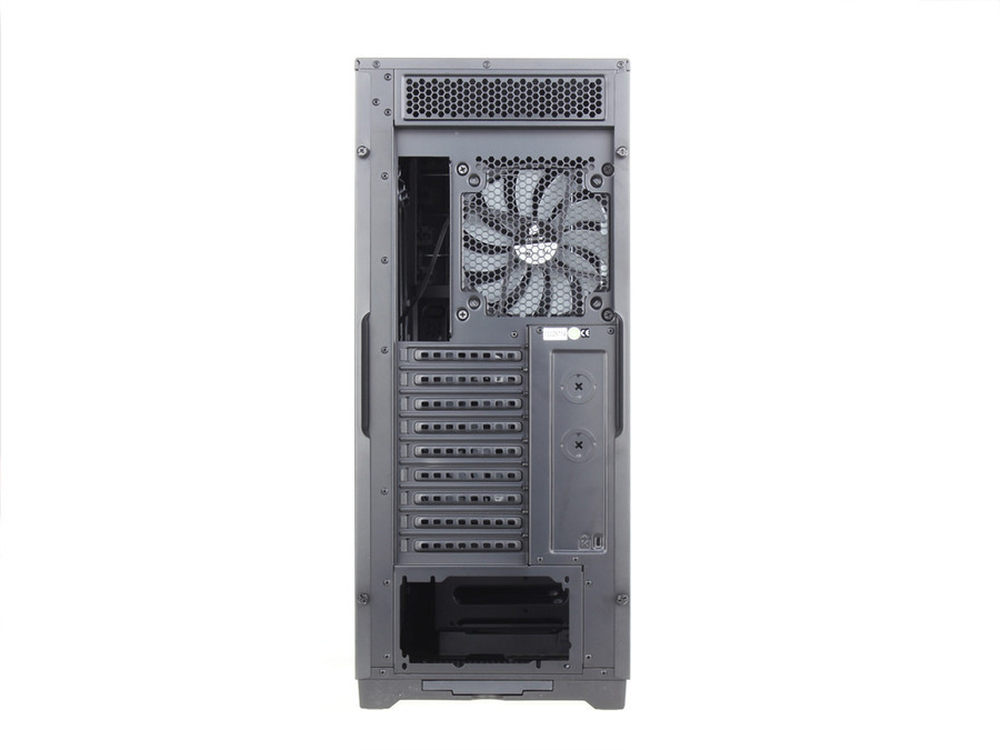 翻到机箱背部我们来看看结构,黑化、下置电源是当下机箱的必备元素,海盗船750D毫无保留的配置全面。扩展方面机箱提供了9个扩展槽,无疑意味着ATX、Micro-ATX以及ITX主板的兼容,9槽的配置对于单卡甚至是多卡平台绰绰有余,绝大多数的游戏平台都能胜任。散热方面机箱背部提供了一颗排热风扇,可以加速CPU区域的空气流通,双水冷孔则可以兼容外置冷排。14/32