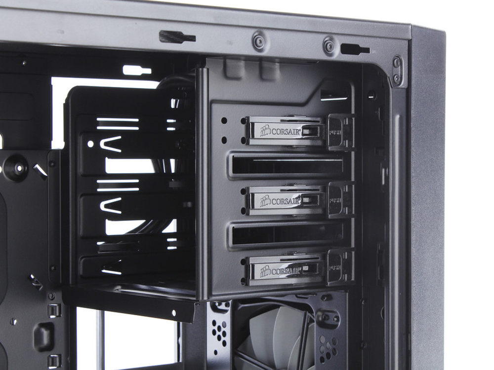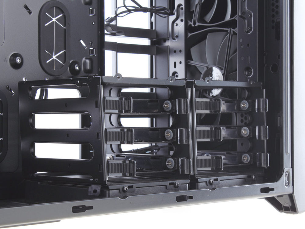 驱动仓扩展方面,海盗船750D机箱提供了3个5.25英寸光驱位、6个3.5英寸硬盘位(2个硬盘笼,也可以装12块2.5英寸SSD)、4个侧置2.5英寸SSD和9个PCI扩展位,可以满足高端玩家的需求。17/32