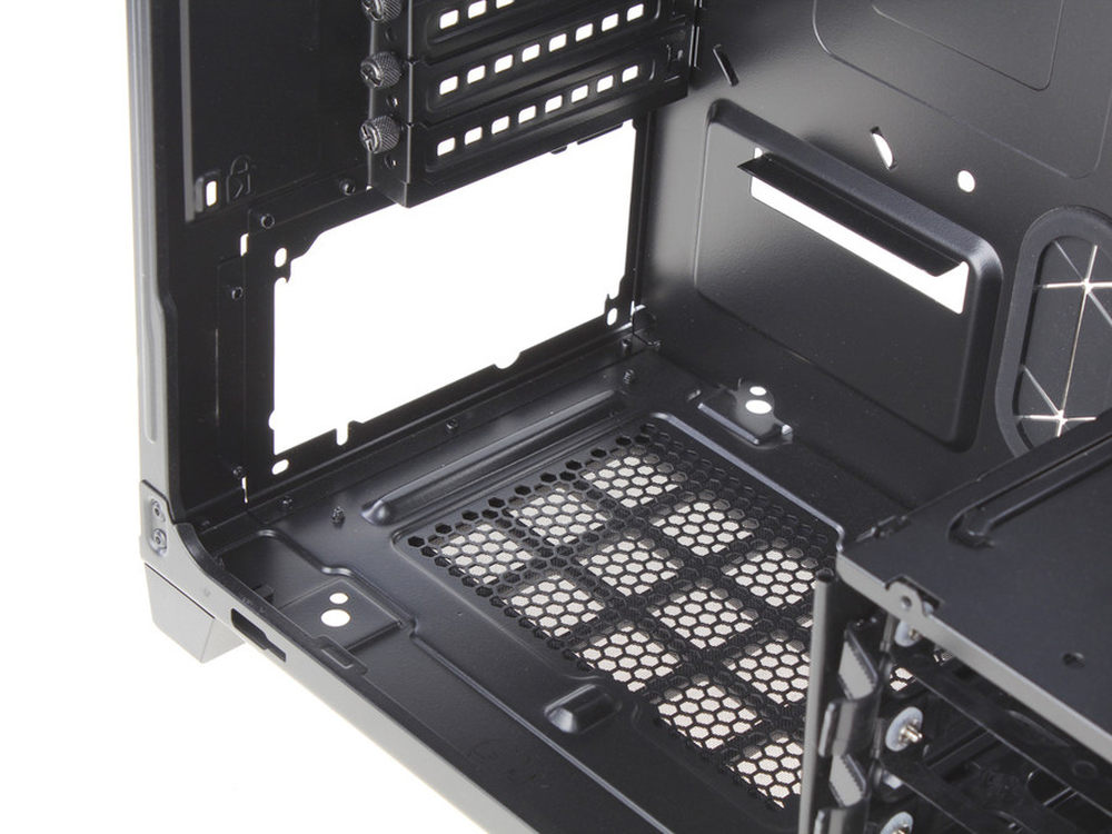 在机箱的底部同样设计了大面积了散热孔位,其中最直观的是电源安装位上的防尘网,剩下的双120mm散热孔位是硬盘安装位置。11/32