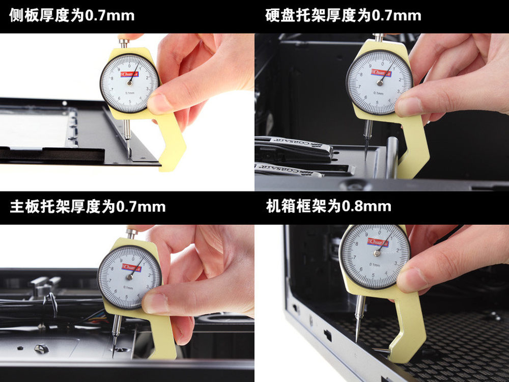 接下来是机箱用料测试,海盗船750D钢板厚度在0.7-0.8mm之间,其中测量的侧板厚度为0.7mm、硬盘架0.7mm、主板托盘0.8mm、机箱框架0.8mm,钢板扎实的用料能够比入门机箱更加稳固的保护硬件安全,同时能够降低共振产生的几率。23/32