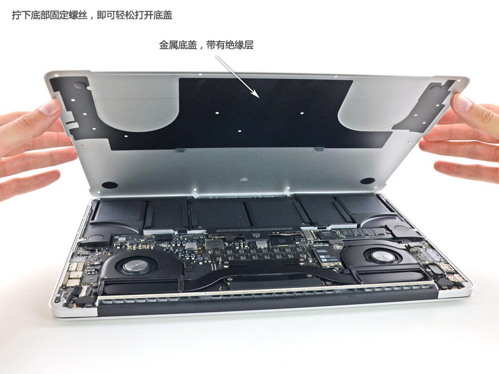 和其它MacBook的拆解一样,只需要使用专用的螺丝刀拧下机身底部的所有螺丝,即可打开视网膜屏幕MacBook Pro的金属底盖。可以看到,苹果在底盖上进行了绝缘处理,一方面防止短路,另一方面防止电击穿。3/19