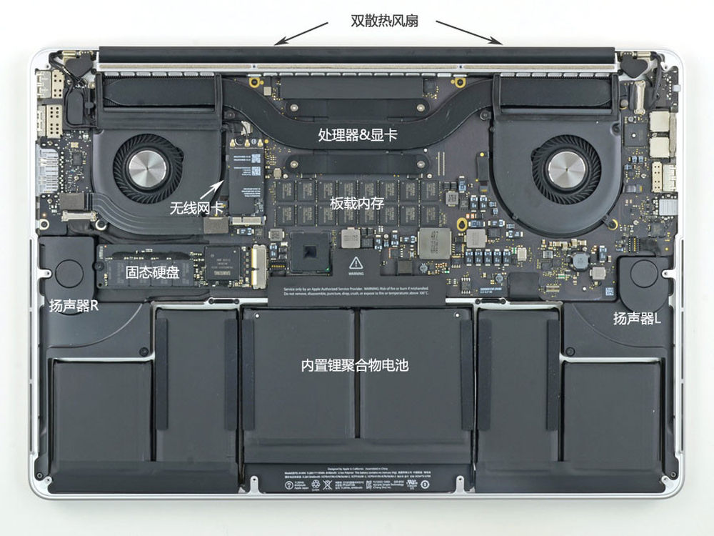 视网膜版MacBook Pro的机器内部,可以看到,电池依旧占据了几乎一半儿的空间。该机采用双风扇散热,配备全新固态硬盘及无线网卡,除此之外就只有一张高度整合的主板。4/19