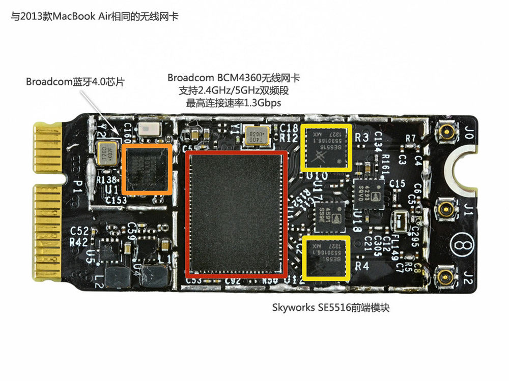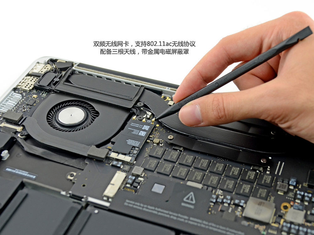 视网膜版本的MacBook Pro同样加入了802.11ac无线协议,其无线网卡和MacBook Air的相同,无论是芯片,还是体积,都一模一样。8/19