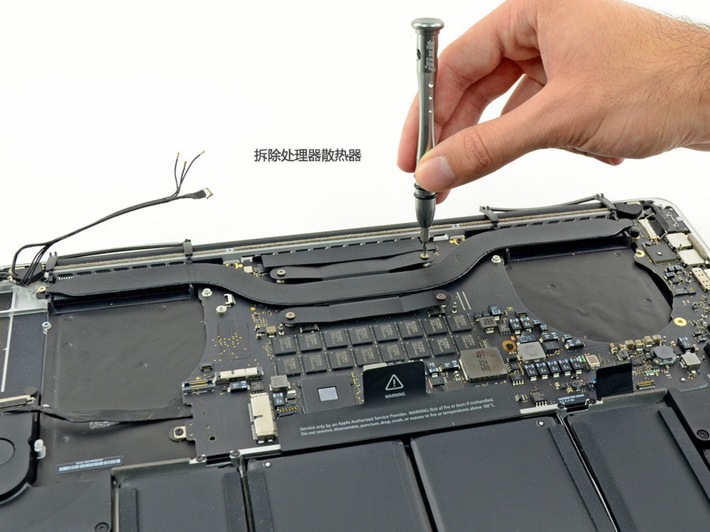 拆除视网膜MacBook Pro的处理器散热器。(15英寸低配版不具备独立显卡,因此散热器就这一个)11/19