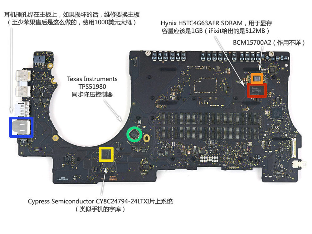 15英寸视网膜MacBook Pro低配版的主板一侧展示,它采用Haswell架构第四代智能酷睿i7-4750HQ处理器,板载BGA封装,不可更换,带Intel Iris Pro HD Graphics 5200(GT3e)锐炬核芯显卡以及128MB eDRAM(相当于处理器的四级缓存,凭借超高的带宽与读取/写入速度,为核芯显卡提供充足且快速的显存),拥有媲美独显的图形性能。